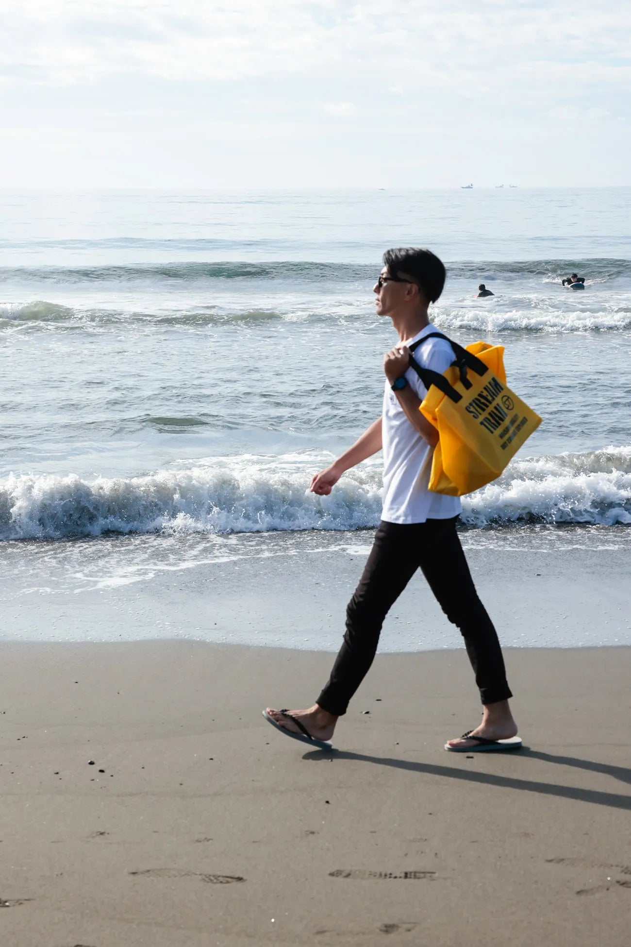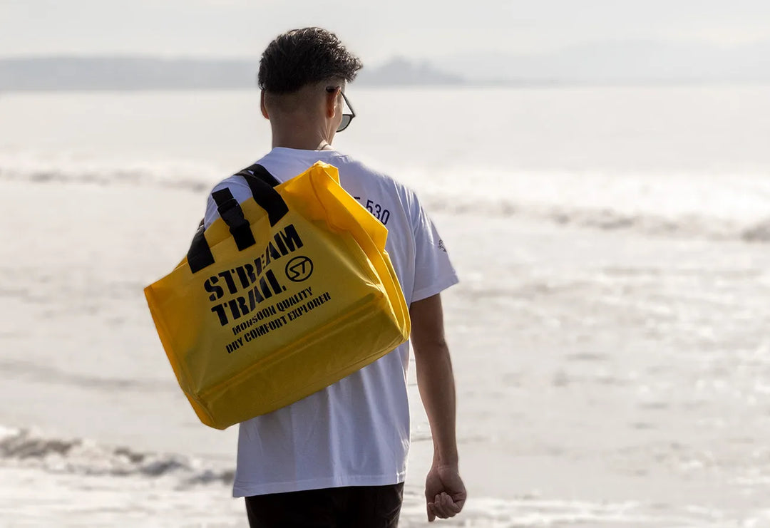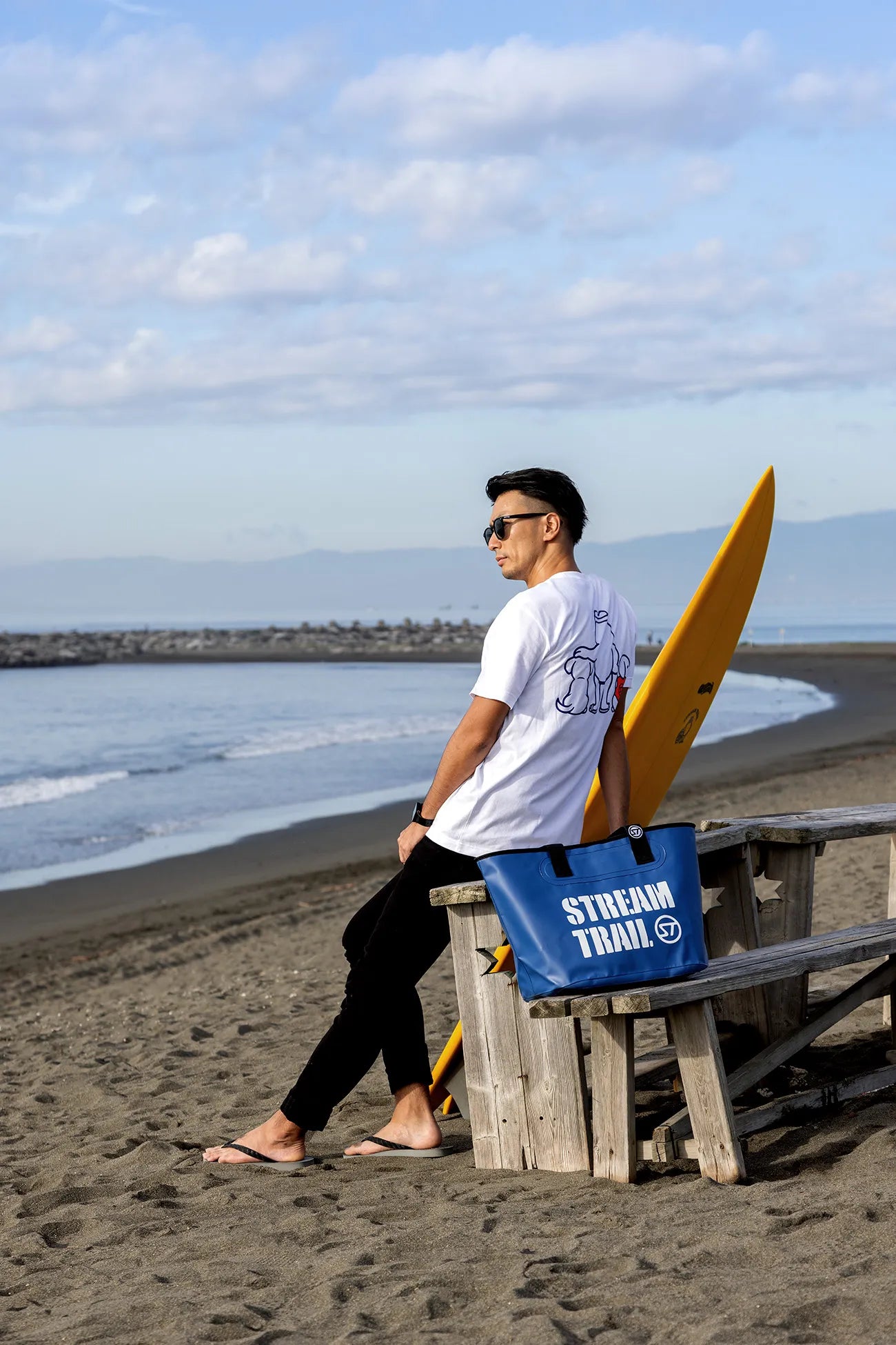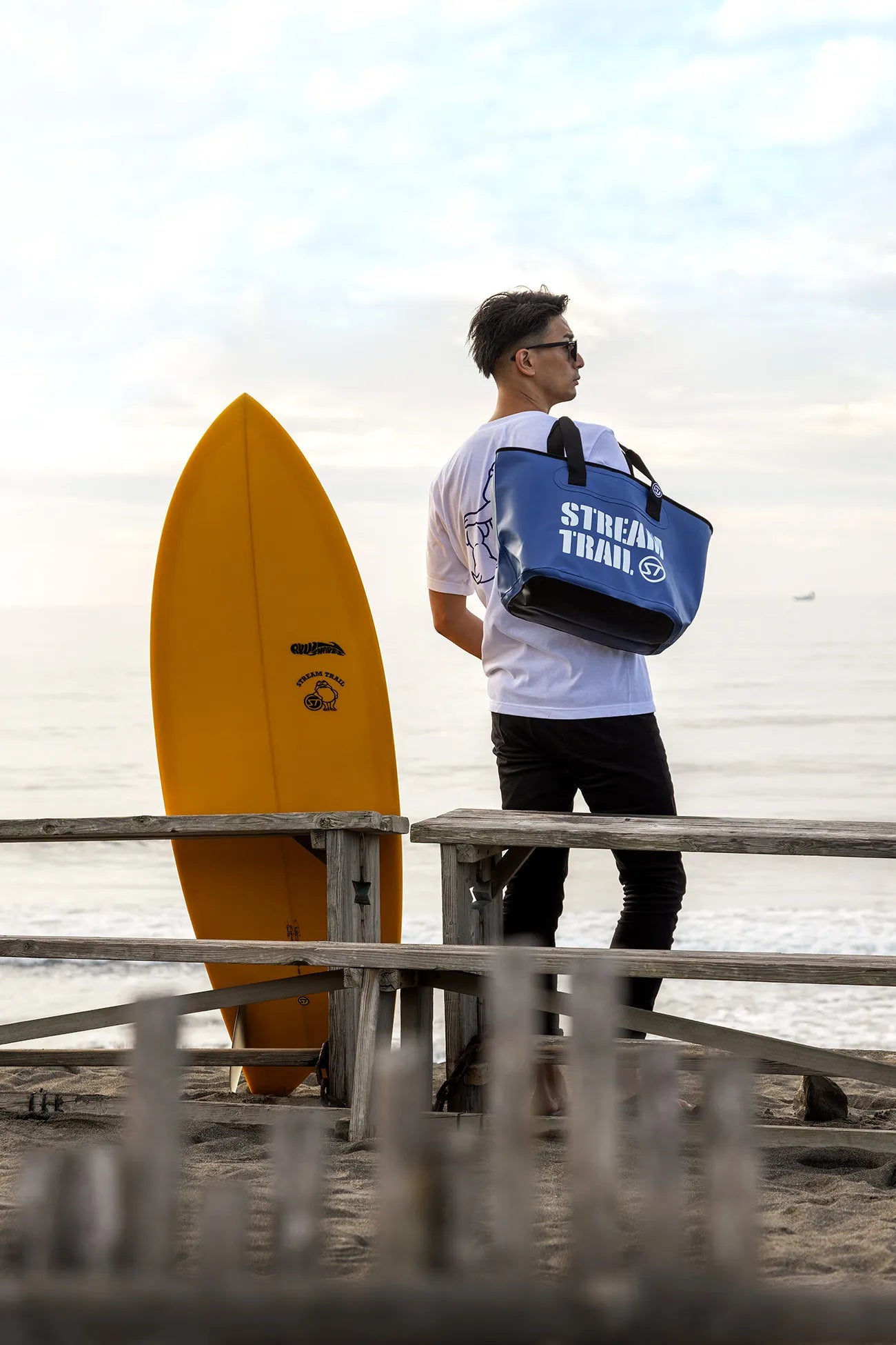 朝の静かな海で、ボードと一緒に肩に掛けるのは頼れる大容量のトート。濡れたウェアも砂のついた小物も、ためらわずそのまま放り込めるラフさが心地いい。