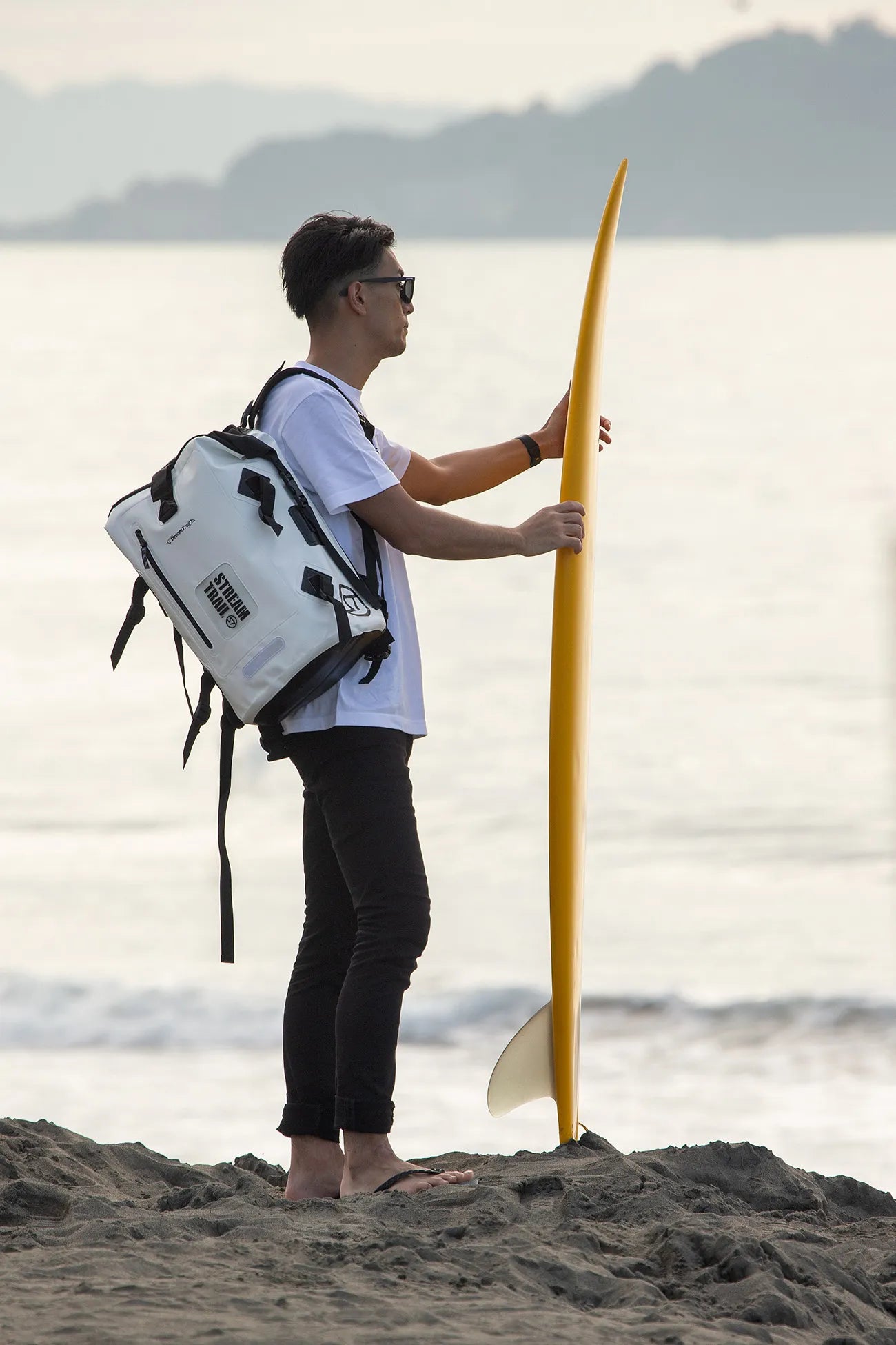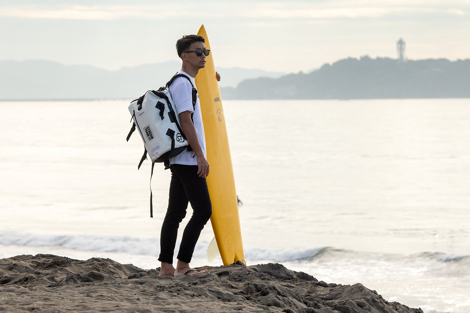 ロールダウン仕様の口を閉じれば、波打ち際の水しぶきも気にならない。シンプルで力強い存在感は、海だけでなく街にも自然に溶け込み、週末のアクティブな時間から日常の移動までを支えてくれる。サーフィンを終えた帰り道も、波に包まれた余韻をそのまま抱えて、背中とともに静かに歩き出す。