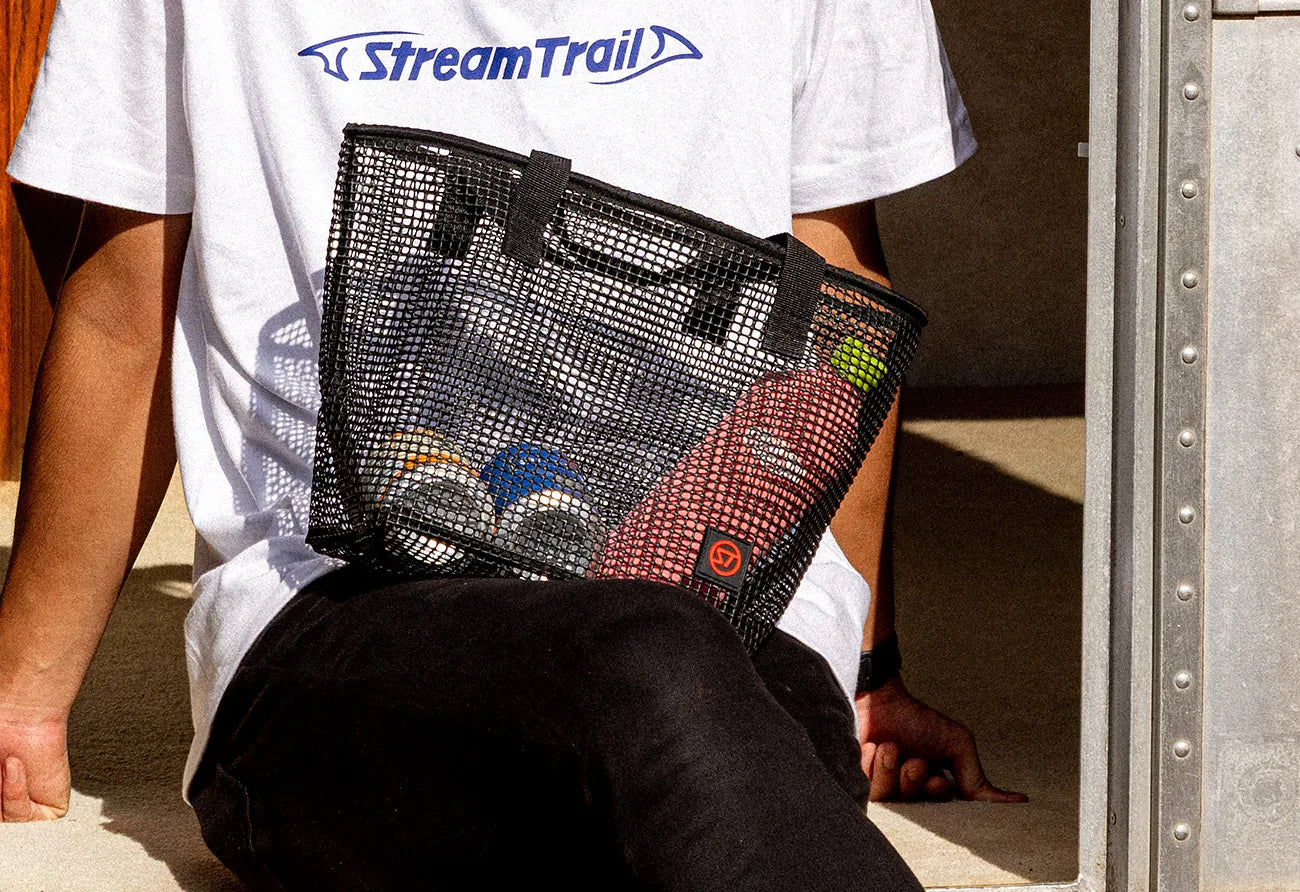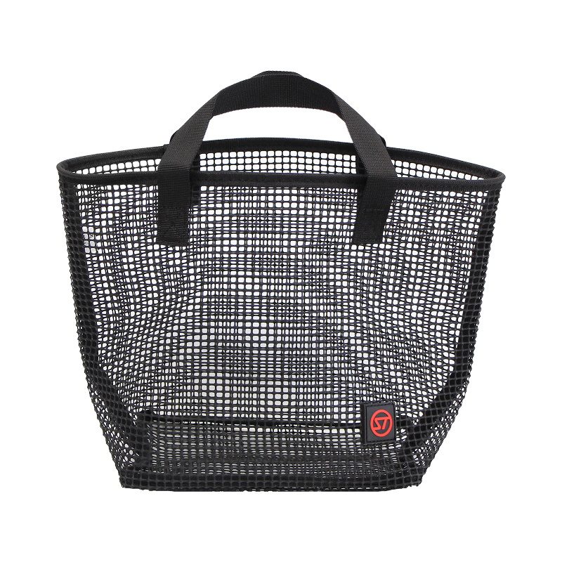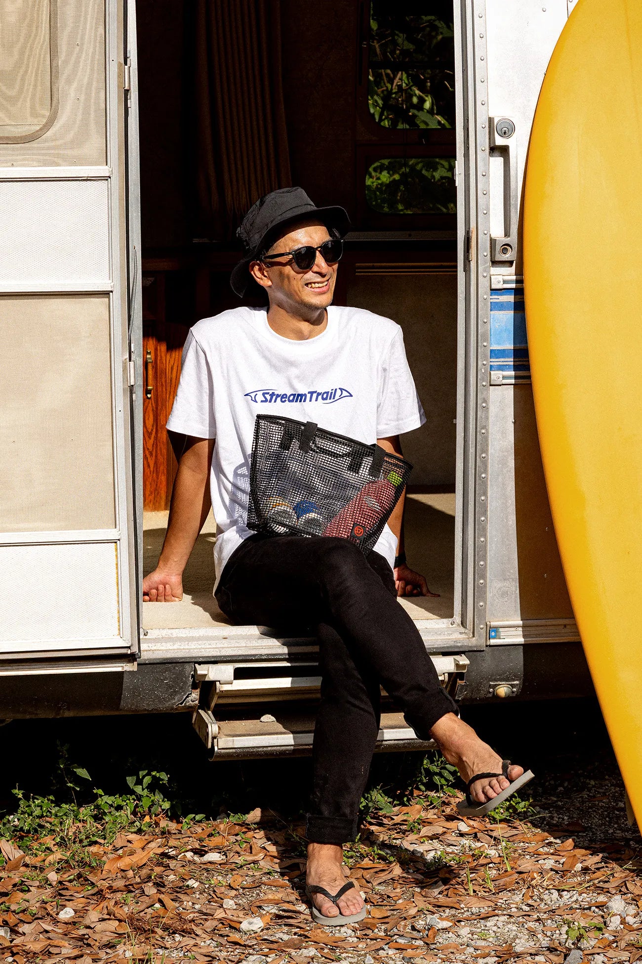 海で濡れたサンダルや小物を気にせず放り込めるメッシュトートは、そんな一日の始まりにぴったりだ。