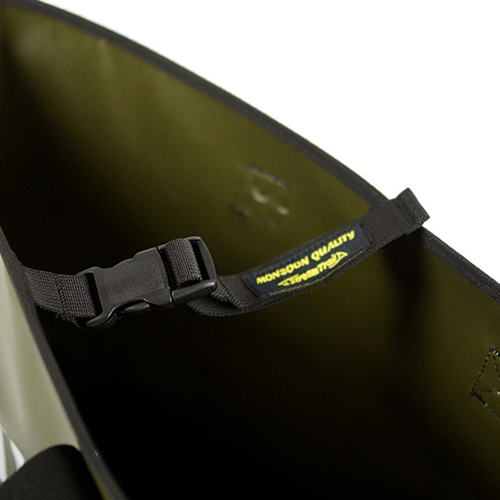 バックルで開口部を留められ、中身の飛び出しや砂の侵入を防ぎます。